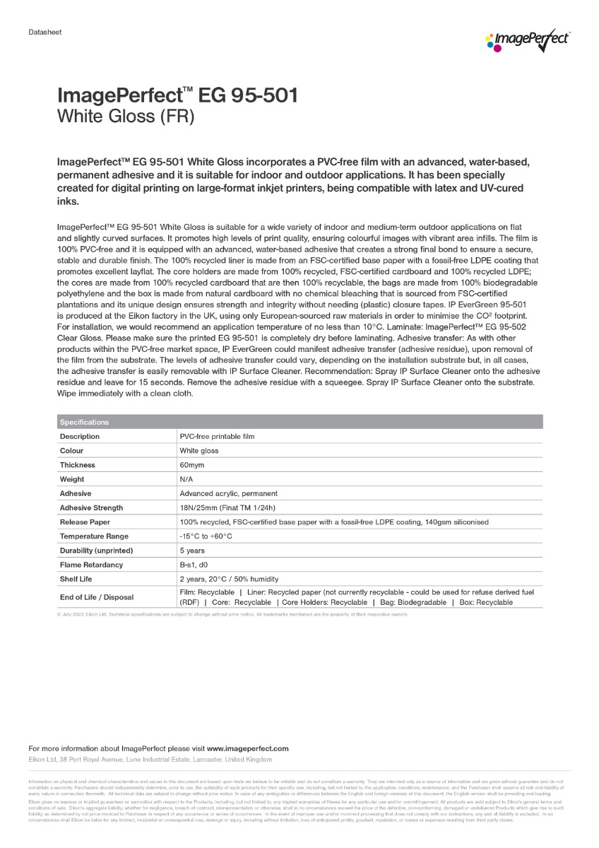 Die Folie wird in Europa (UK) hergestellt, ausschließlich mit europäischen Rohstoffen, um Transportwege kurz und den Energiebedarf gering zu halten – ein weiterer Beitrag zur CO₂-Reduktion und Nachhaltigkeit. Mit einer Lebensdauer von bis zu 5 Jahren im Außenbereich überzeugt die ImagePerfect™ EverGreen 95-502 durch langfristige Haftung, Witterungsbeständigkeit und UV-Stabilität. In Kombination mit dem passenden ImagePerfect™ EG 95-502 Clear Gloss Laminat entsteht ein langlebiger, nachhaltiger Schutz für brillante und farbstabile Drucke. Der Aufkleber PVC-frei High Tack ist damit die ideale Wahl für Unternehmen, die starke Haftung, professionelle Optik und ökologische Verantwortung in einem Produkt vereinen möchten.