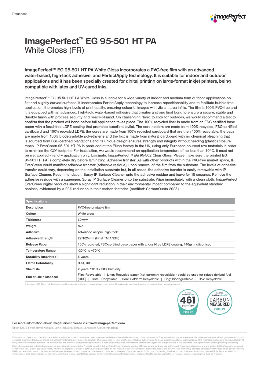 Die ImagePerfect™ EverGreen 95-501 White Gloss ist damit die perfekte Wahl für Unternehmen, die hochwertige Werbegrafiken, langlebige Beschriftungen und nachhaltige Materialien miteinander vereinen möchten – ganz ohne Kompromisse bei Leistung oder Optik.