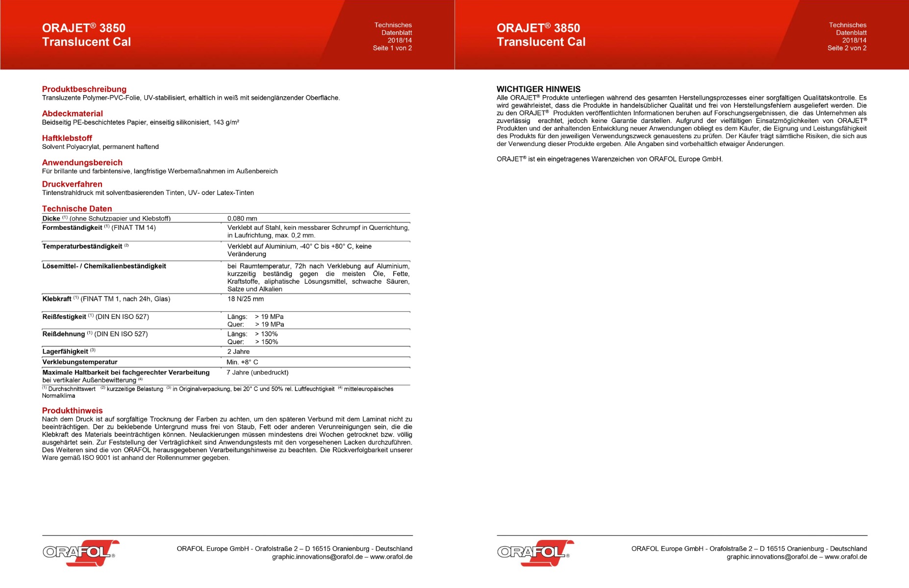 Die Orajet 3850 Translucent zeichnet sich durch hohe Formstabilität und minimale Schrumpfung aus (max. 0,2 mm längs, kein messbarer Schrumpf quer). Sie bleibt auch unter Temperaturschwankungen zuverlässig dimensionsstabil und sorgt so für ein dauerhaft perfektes Erscheinungsbild. Die Folie ist beständig gegen Öle, Fette, Kraftstoffe, aliphatische Lösungsmittel, schwache Säuren, Salze und Alkalien – und damit bestens geeignet für den professionellen Außeneinsatz unter unterschiedlichsten Umweltbedingungen. Ihre Temperaturbeständigkeit von -40 °C bis +80 °C macht sie besonders robust und zuverlässig, selbst bei extremer Witterung.