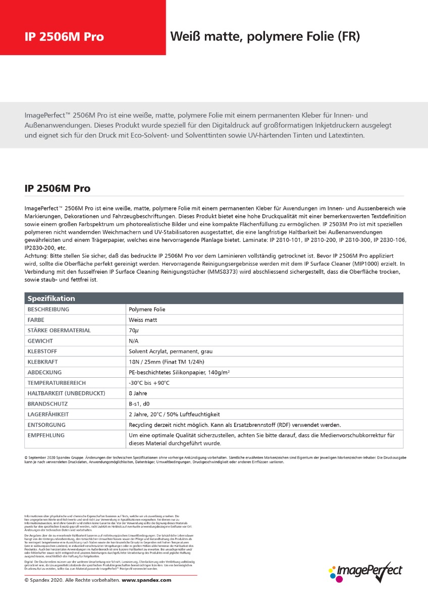 Der Aufkleber weiß matt aus ImagePerfect™ 2506 Pro ist eine hochwertige, polymere Hochleistungsfolie, die speziell für mittelfristige Werbe- und Beschriftungsanwendungen im Innen- und Außenbereich entwickelt wurde. Sie überzeugt durch ihre gleichmäßige, reflexionsarme Oberfläche und ihre exzellente Druckqualität – ideal für professionelle, dezente Gestaltungen. Die weiß matte, polymer kalandrierte PVC-Folie ist mit einem permanenten, grauen Solvent-Acrylat-Klebstoffausgestattet, der eine hervorragende Haftkraft und hohe Opazität bietet. Dadurch werden auch dunkle Untergründe zuverlässig abgedeckt, und das Druckbild bleibt farbtreu und klar.