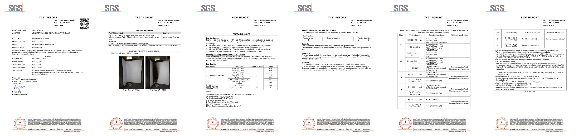 Die Dokumente enthalten offizielle Prüfergebnisse akkreditierter Institute und weisen das Brandverhalten des Produkts nach geltenden Normen (z. B. EN 13501-1, ASTM E84) aus.