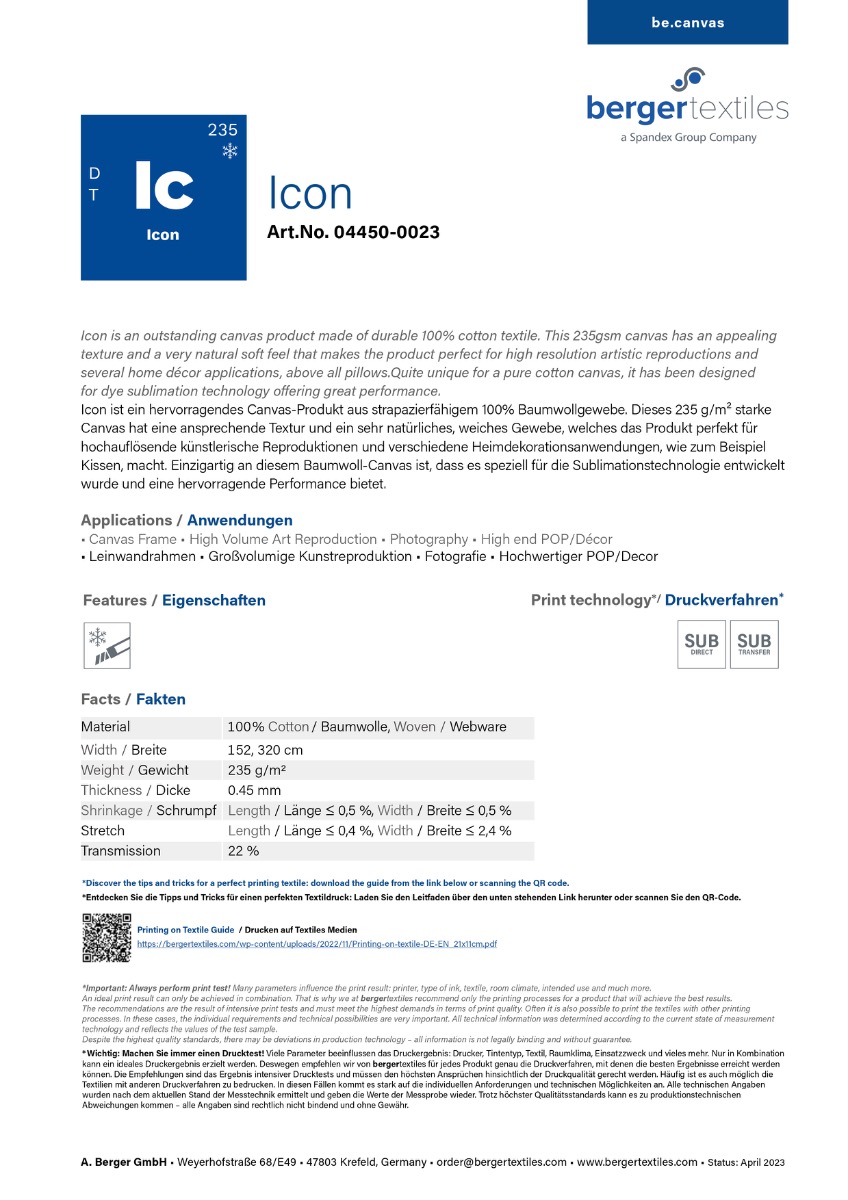 Premium Öko 100% Baumwolle • Haltbarkeit Indoor: Mindestens 10 Jahre • Oberfläche: glatt, samtig • Farbauflösung: Unschlagbar hoch • Anwendung: Für premium Kunst und Designs • Besonderheiten: Luxuriöses Erscheinungsbild für hochwertige Präsentationen in Studio Qualität |