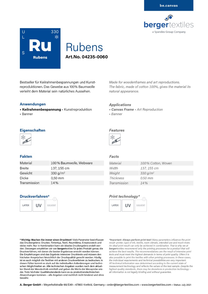 Standard Öko 100% Baumwolle • Haltbarkeit Indoor: Mindestens 10 Jahre • Oberfläche: matt strukturiert • Farbauflösung: Hoch • Anwendung: Für künstlerische Drucke aller Art • Besonderheiten: Atmungsaktives Naturmaterial nachhaltige Anwendungen aller Art |