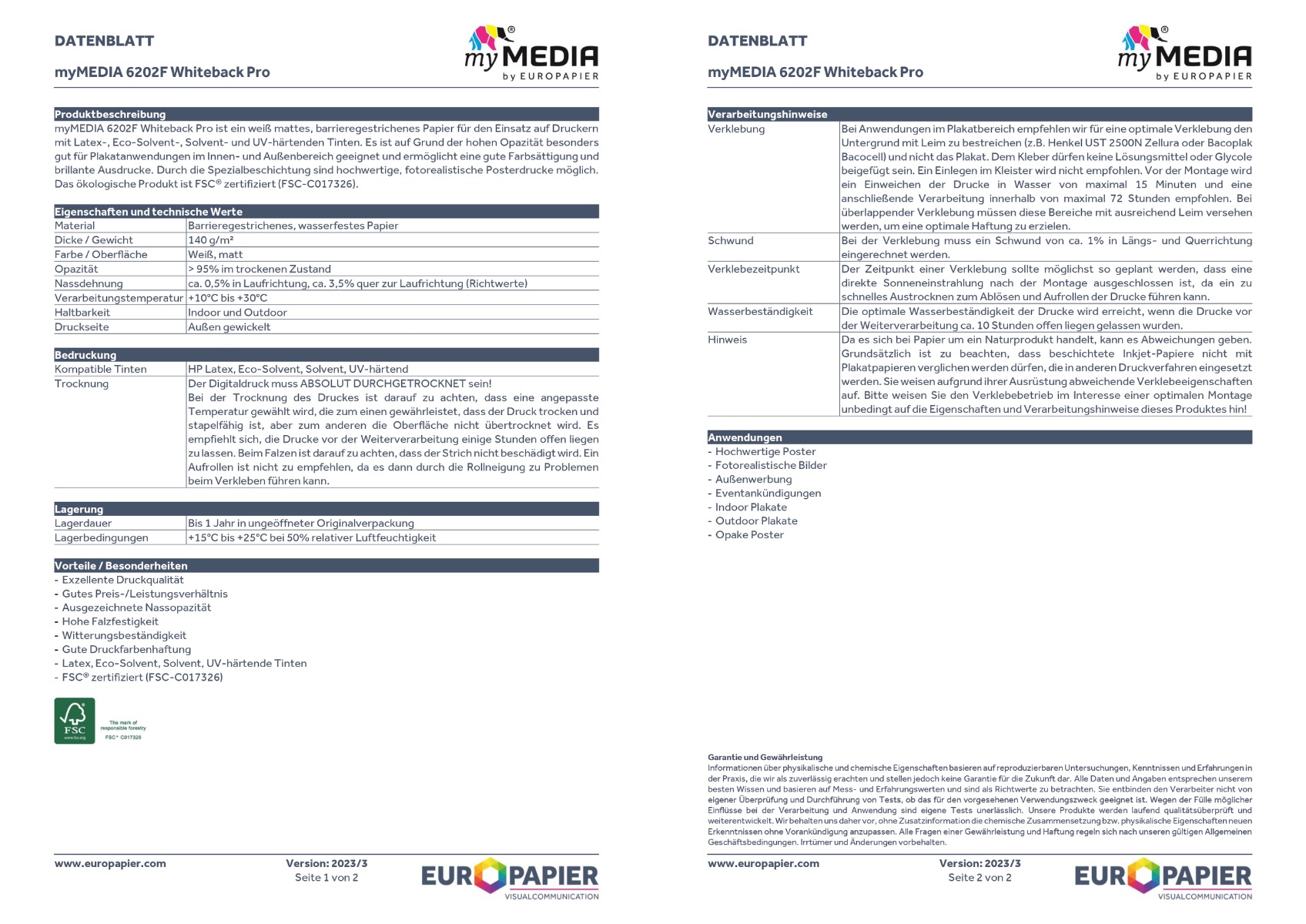 Dank seiner wasserbeständigen Oberfläche ist das Material sowohl für kurz- bis mittelfristige Außenwerbung als auch für den Einsatz im Innenbereich geeignet. Es überzeugt durch hohe Dimensionsstabilität, gute Falzfestigkeit und zuverlässige Witterungsbeständigkeit bei wechselnden Bedingungen. Das myMEDIA 6202F Whiteback Pro ist kompatibel mit Latex-, Solvent-, Eco-Solvent- und UV-härtenden Tintenund gewährleistet eine gleichmäßig brillante Farbwirkung auf allen Drucksystemen. Bei der Verwendung von UV-Tinten empfiehlt der Hersteller einen Drucktest zur Haftungsprüfung, um die bestmögliche Qualität sicherzustellen.